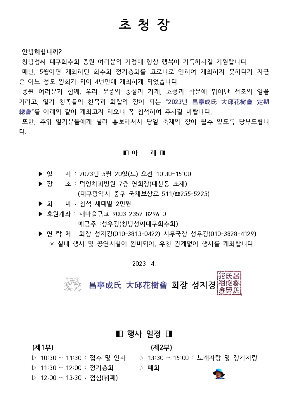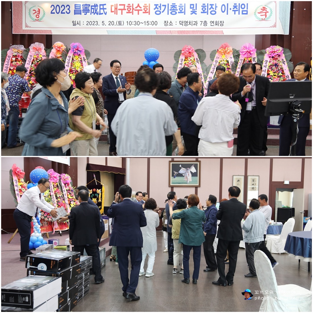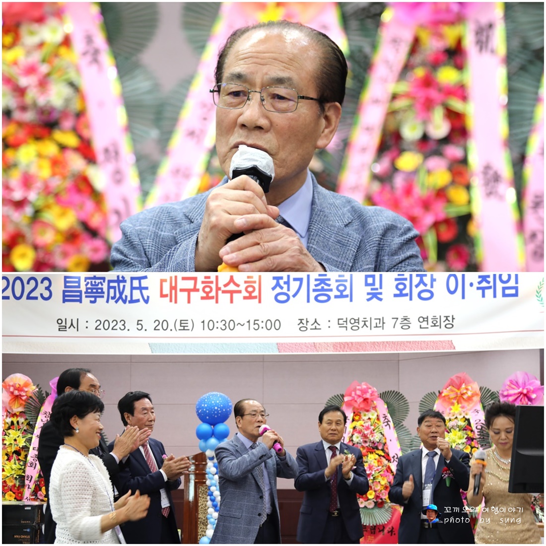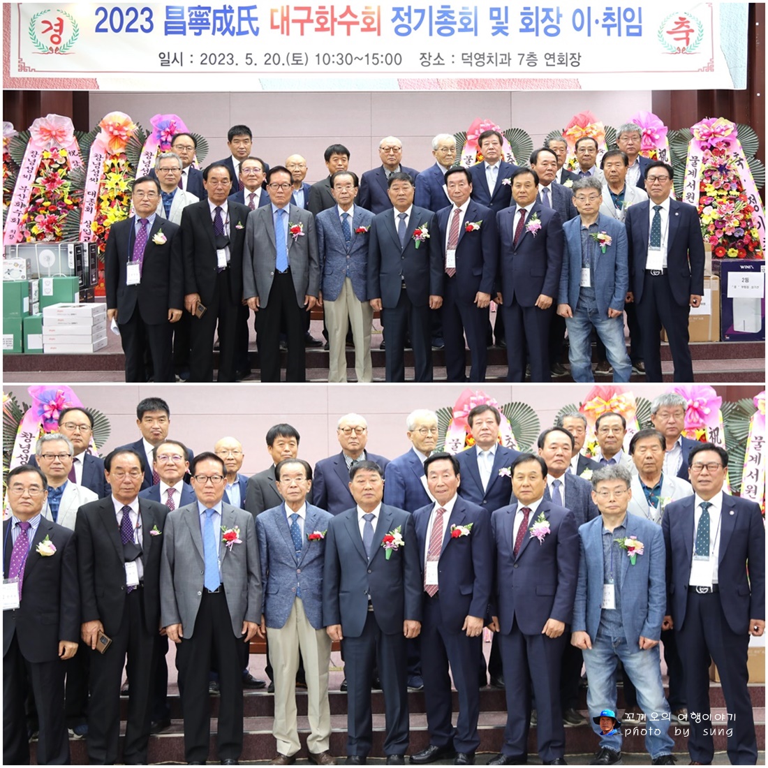 창녕성씨 대구화수회에서는 2022년 회계년도 결산 정기총회(회장 성지경)가 2023년 5월 20일(일) 11시부터 대구시 중구 소재 덕영치과병원 7층 대연회장에서 임원 및 종원 150여명이 참석한 가운데 개최하였다. 회의 진행순서는 성우경 사무국장의 사회진행으로 국민의례, 선조배례, 상견례가 있었고 성지경 화수회장님의 내빈소개에 이어서 내빈축사와 더불어 종원 여러분들과 함께 우리 문중의 충절과 기개. 효성과 학문이 뛰어난 선조의 얼을 기리고 또한 일가 친족들의 친목과 화합의 장을 마련하여 대구시내에서 거주하는 우리 창녕성가 종원님들과 함께 화수회 행사가 성황리에 이루어졌다. 우리 창녕성가들은 다른 성씨들보다도 유달리 본(本)이 하나인 단 본으로서 모두들이 한 가족처럼 일족들이다. 그래서 우리 성가들은 어디를 가더라도 창녕(昌寧) 성(成)가라고 하면 남달리 애정이 더 있기도 하면서 반가운 나머지 일가로서 인정이 넘치는 유일한 일족들의 단합된 모습이 창녕성가의 자부심을 느끼기도 할 것이다. 창녕성가들은 모두 다 한결 같이 시조이신 성(成) 인자 보자 할아버지의 유일한 자손들이다. 종원 여러 분들과 한자리에 만나서 이야기와 웃음꽃을 나누며 대구 화수회 행사장의 즐거운 시간들은 먼 훗날의 아름다운 추억으로 길이길이 남을 것이다.