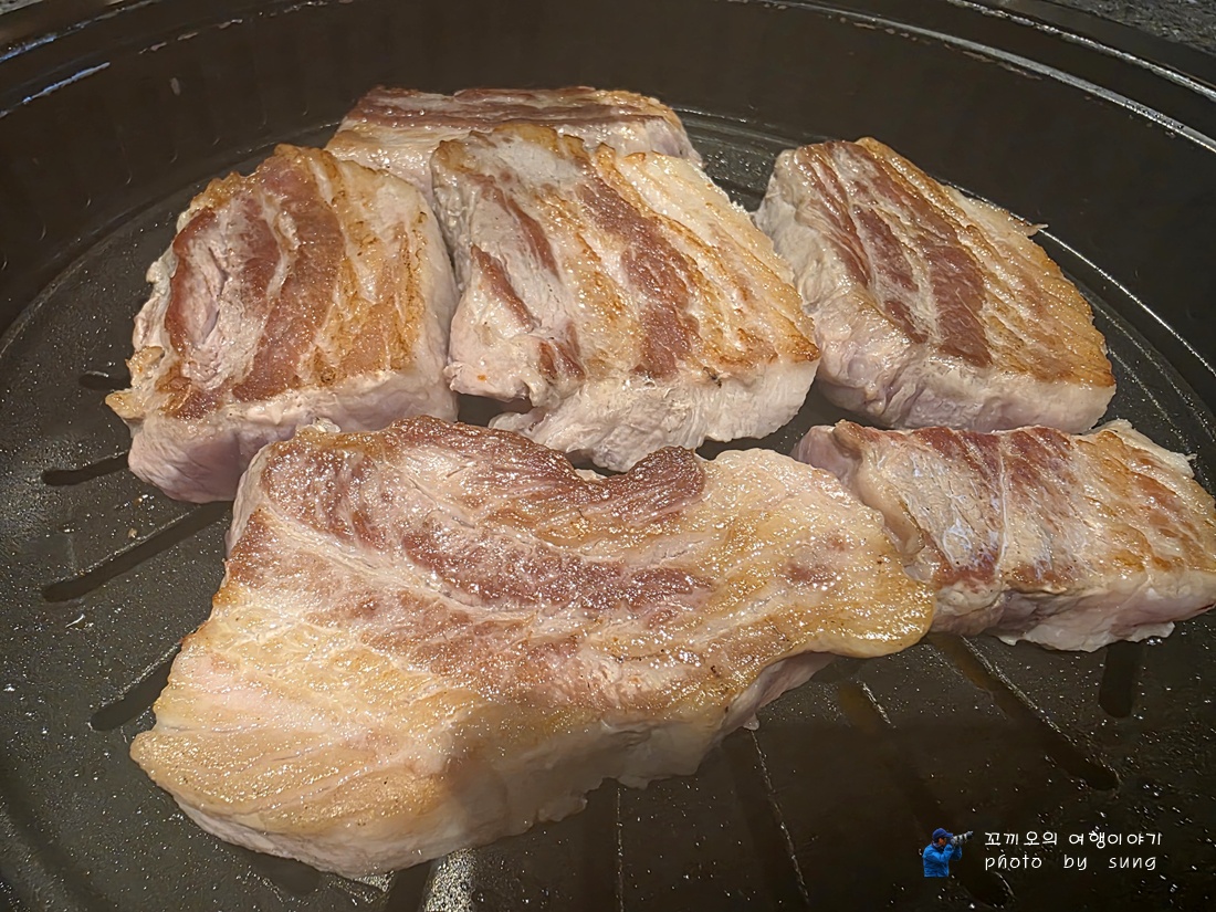 잘 구운 돼지고기를 익혀서 먹어보면 구수한 그 맛이 일품이다.