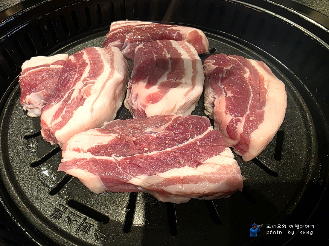 돼지만의 식당에서 먹는 삼겹살은 특이하고 두툼한 삼겹살이라서 그런지 육즙이 마르지 않고 그대로 있어서
