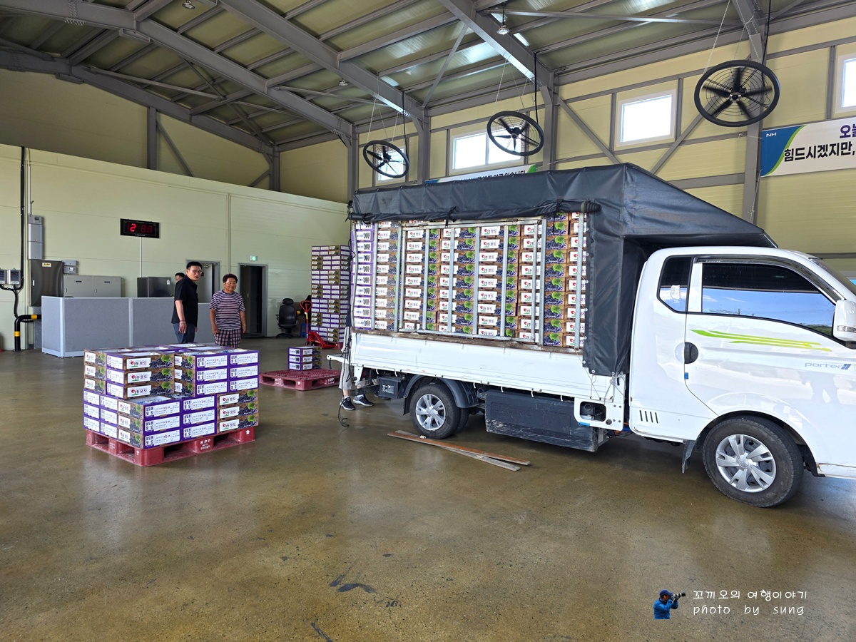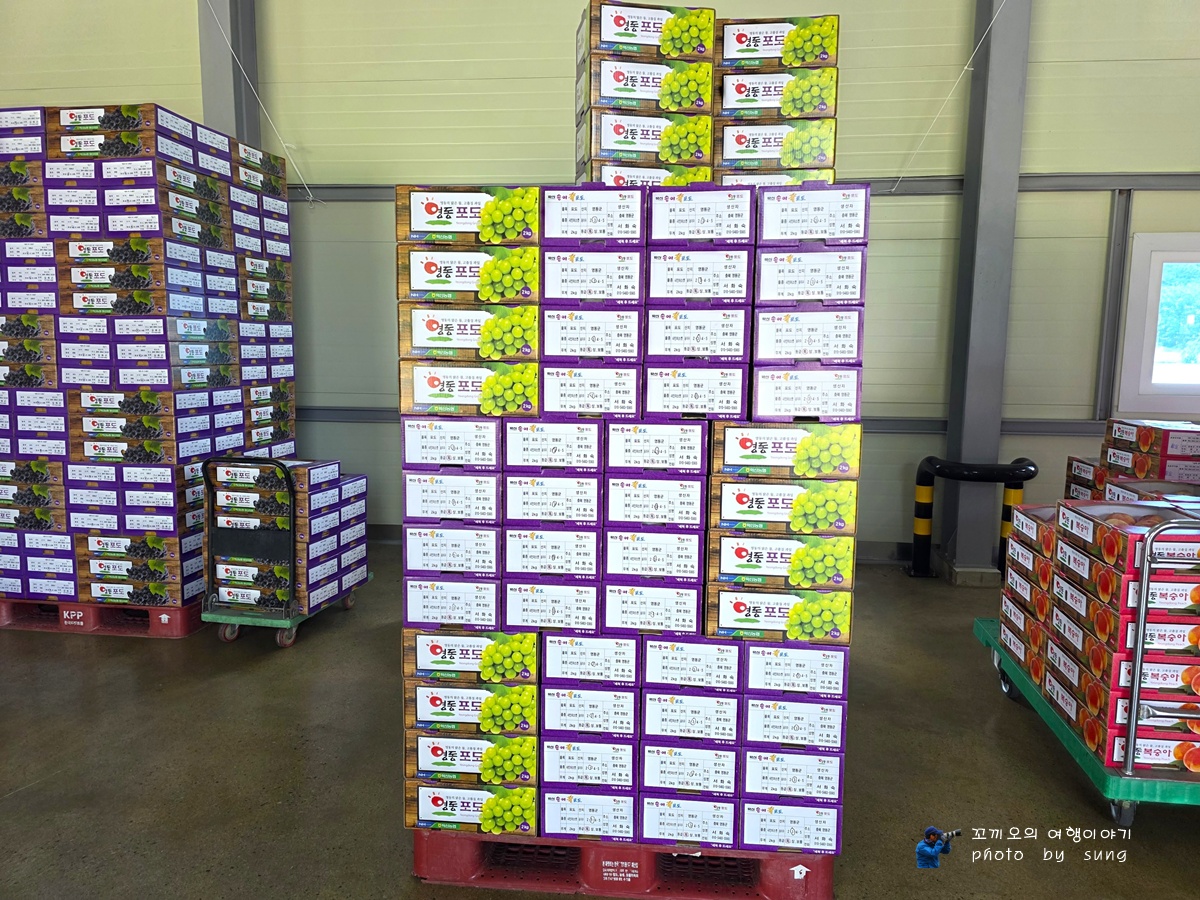 농민들이 농사를 지은 포도를 상자에 포장하여 이곳 산지유통센터에서 집결하여 전국 농산물 도매시장으로 출하를 하여 경매가 이루어 진다.