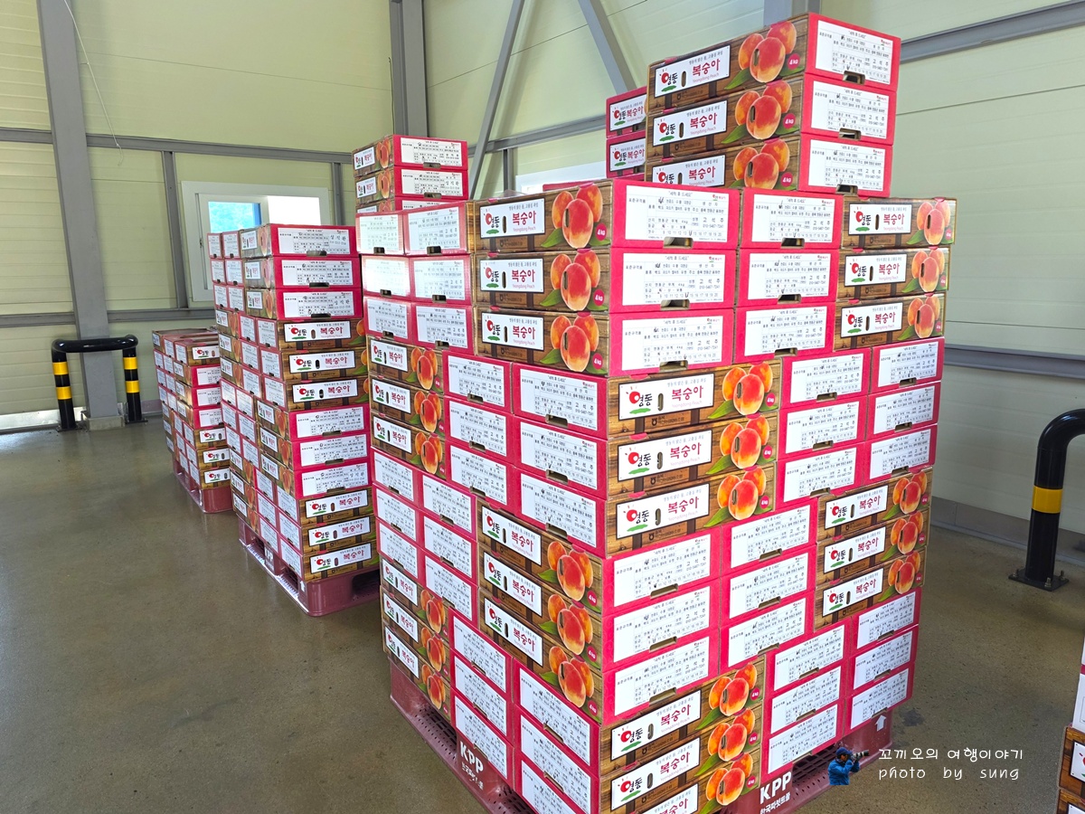 그래서 농민들이 농사를 지은 과일(포도, 복숭아)을 서울로 출하 하기 위하여 농협 산지유통센터로 입고를 하는 장면이다.