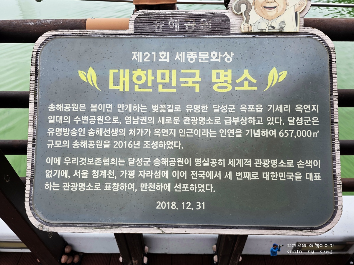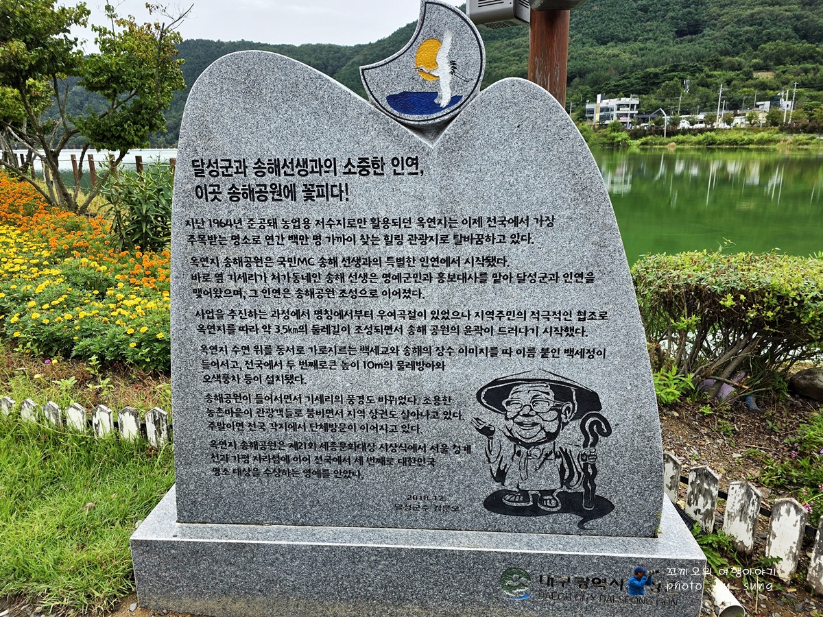 대구시 달성군 옥포읍 기세리에 위치하고 있는 옥연지 송해공원에 들렀다가 송해공원의 가을 풍경을 담아보았다. 이곳 송해공원은 대구 시티투어로 유명하여 중국인의 관광객들이 많이 찾아오는 국내 명소인 송해공원은 관광객들의 발걸음으로 늘 붐비는 곳이기도 하지만 옥연지의 둘레길도 잘 조성되어 있어서 요즘 같은 초가을에는 걷기 운동하기에도 좋은 곳이다. 그리고 송해공원은 옥연지 일대에 4만7천 300㎡에 이르는 부지에 송해공원을 조성하여 새로운 휴양 코스로 급부상하고 있는 국내 여행 명소로도 유명해졌으며 또한 송해공원은 달성군 명예 군민인 방송인 송해 선생의 이름을 따 명칭한 곳으로 다양한 볼거리로 조성되어 있다. 그리고 송해 기념관 앞에는 전국노래자랑 무대 조성, 송해 조형물 설치 등 다양한 볼거리가 있는 달성군의 대표 관광지로 거듭나면서 시민들이 즐겨 찾는 명소다.