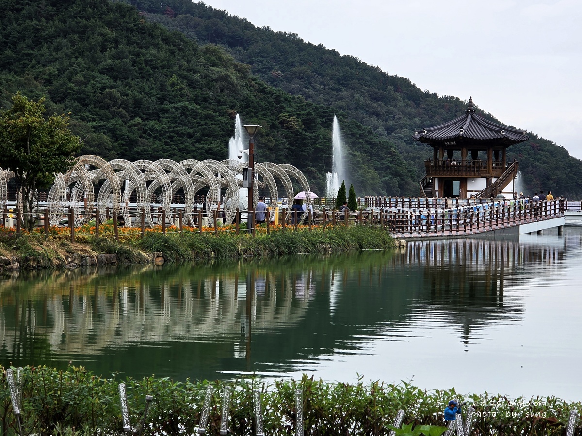 백세정으로 가는 길의 조형물과 반영이 아름다운 풍경이다.