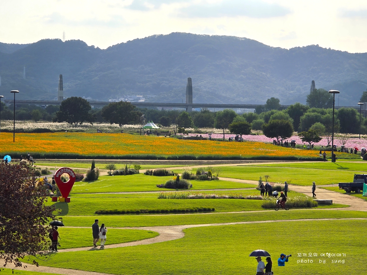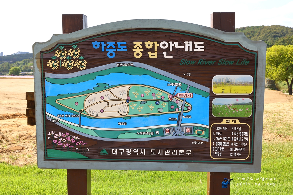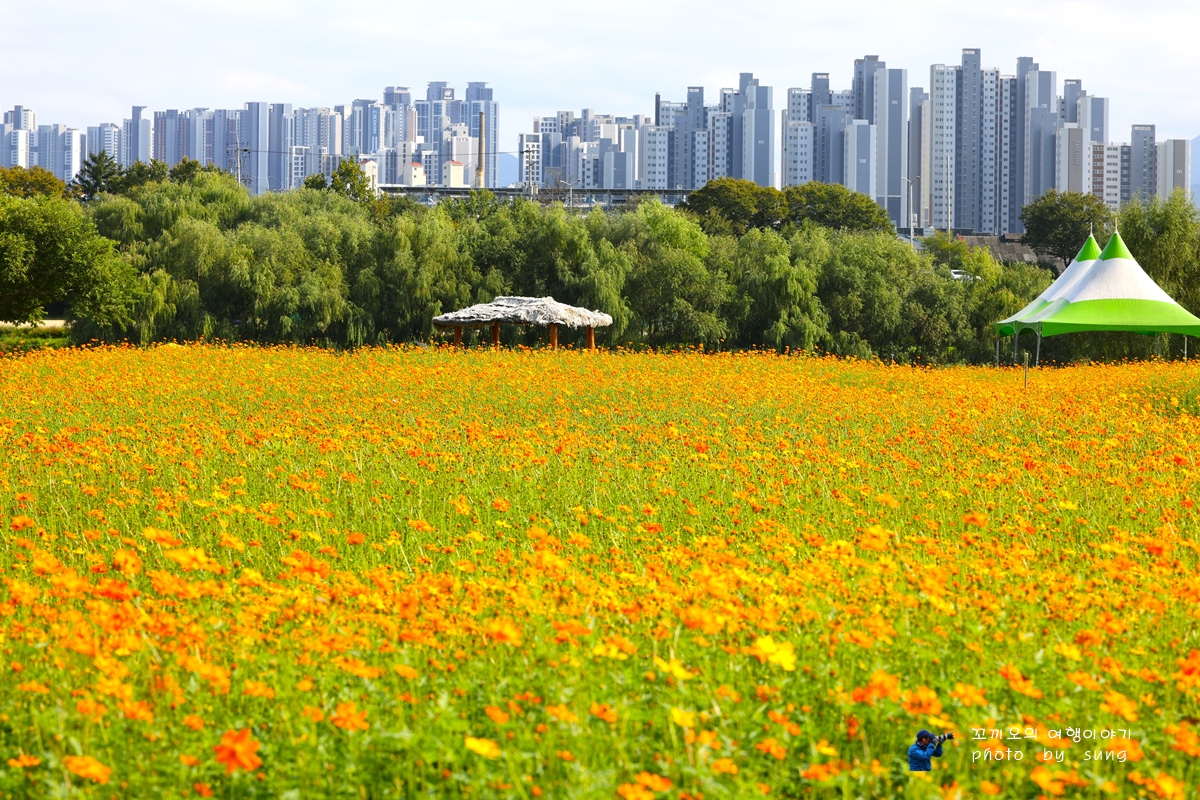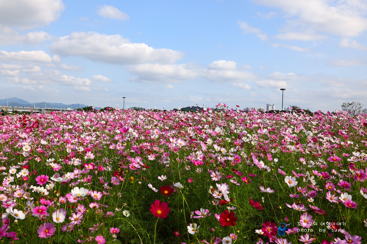 대구시의 대표 관광명소로 급부상하고 있는 북구 노원동 금호강 하중도에는 가을의 전령사인 코스모스가 만개하여 절정을 이루면서 대구 시민들의 발걸음으로 북새통을 이루고 있으며 또한 만개한 코스모스 꽃길을 거닐면서 가을의 정취와 낭만을 즐기기에도 좋은 곳이다. 그리고 금호강 하중도에는 대규모 코스모스 꽃 단지가 축구장 크기의 14배에 달하는 면적에 일반 재래종 코스모스와 황화 코스모스단지를 조성하여 대구 시민들에게 선보이고 있다. 그리고 다가오는 주말(11일-12일)에는 금호강 하중도 코스모스 꽃단지에 연인과 가족과 나들이를 가셔서 금호강의 푸른 물결을 배경으로 코스모스와 함께 아름다운 수변 정취를 느끼면서 산책하면 힐링이 될 것이다.