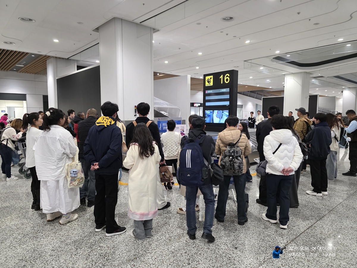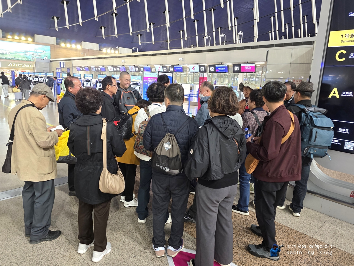 9시 비행기로 떠나기 위하여 중국의 현지 가이드님으로부터 설명을 듣는 모습이다.