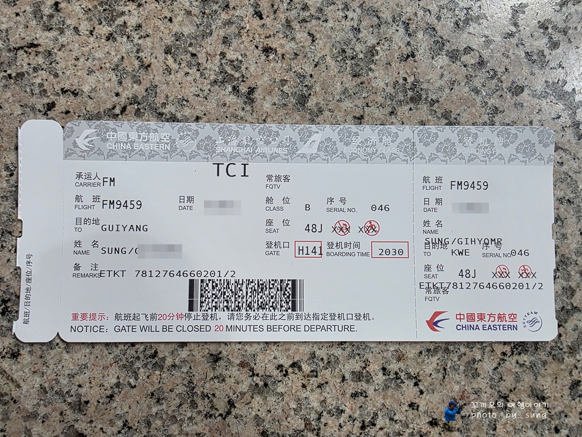 상해공항에서 구이저우성 귀양시공항으로 가는 항공권이다. ㅎㅎ