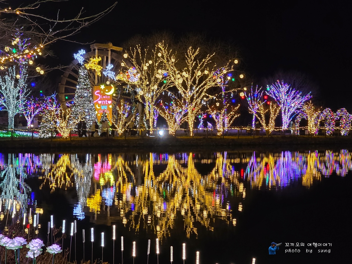 물레방아 주변에도 불빛이 화려하다.