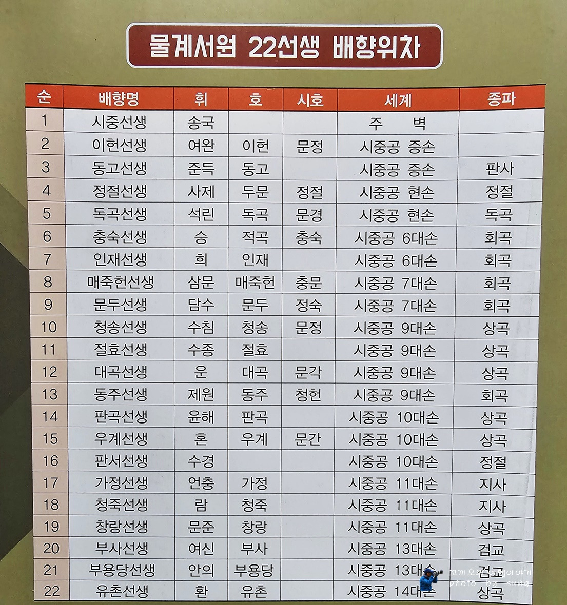22. 유촌선생(휘 환) 16세. 호 : 유촌. 2021년 배향 상곡공파 충성과 효도예절을 대대로 이어가니 그 효성을 하늘이 감동하네. 이에 중정을 맞이하여 제향을 올리옵니다.
