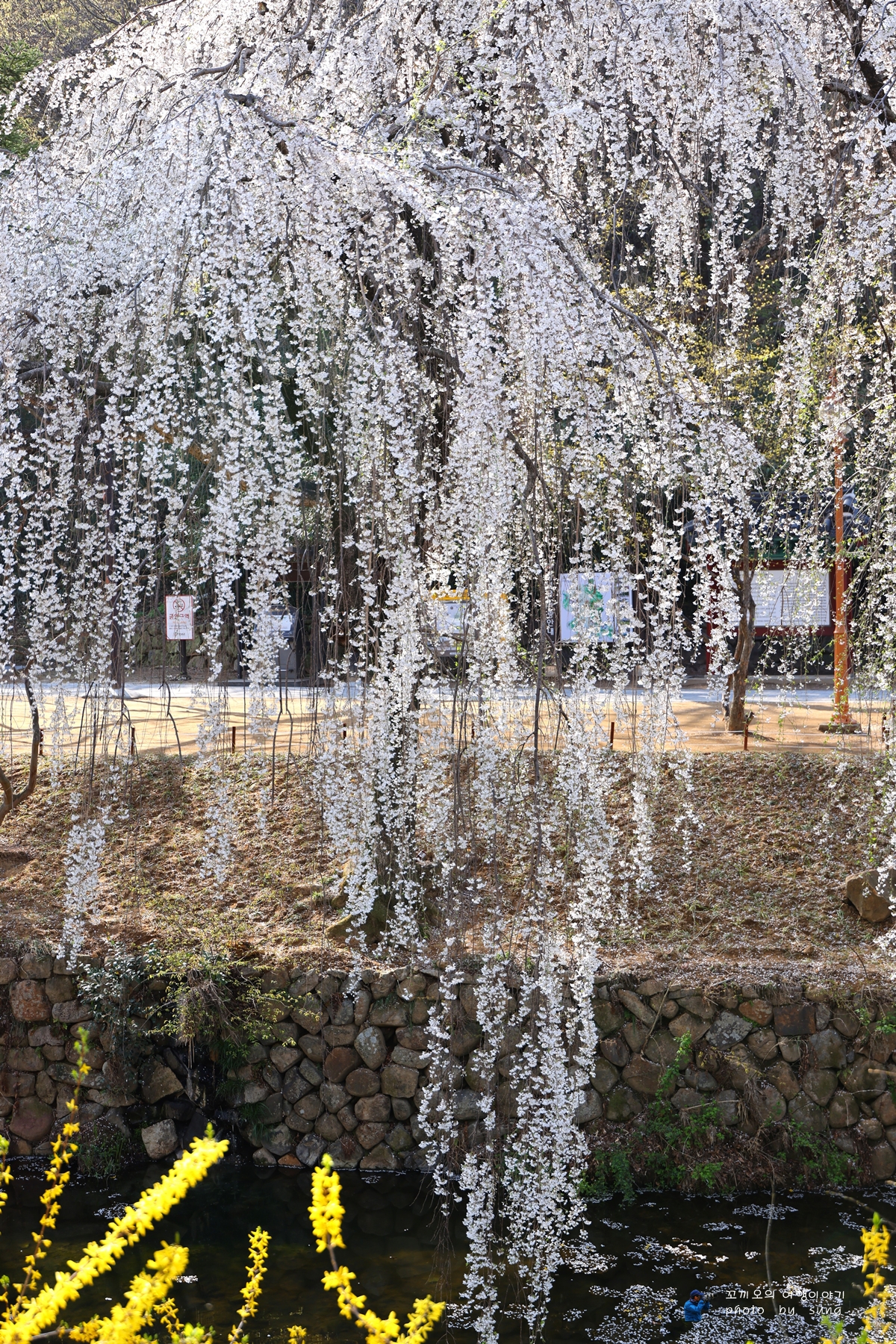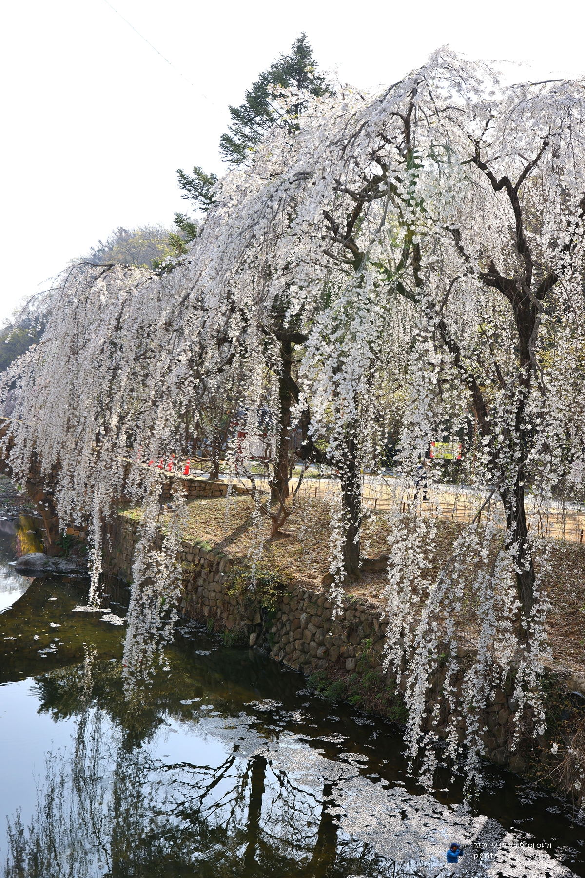 길게 늘어진 나뭇가지에 수양벚꽃이 만발하여 아름다운 풍경이다.