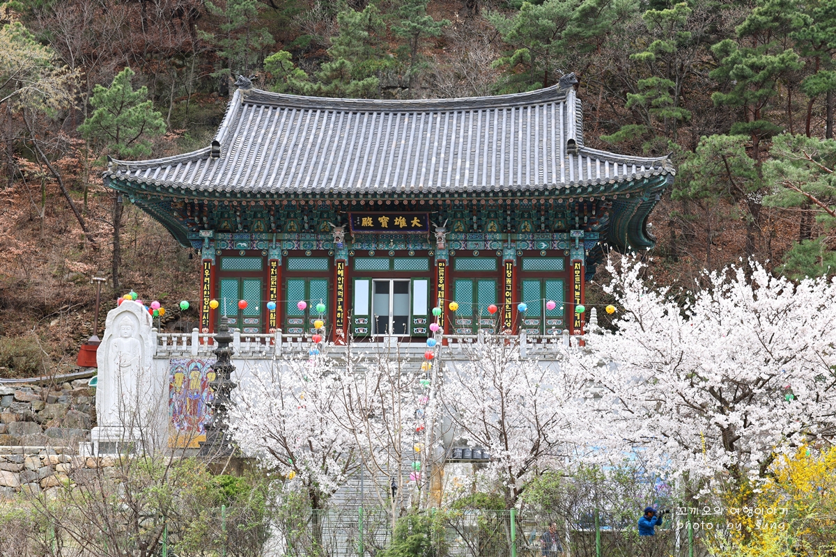 대웅보전 앞에는 벚꽃이 곱게 피어나 사찰과 어우러진 풍경이 멋지다.
